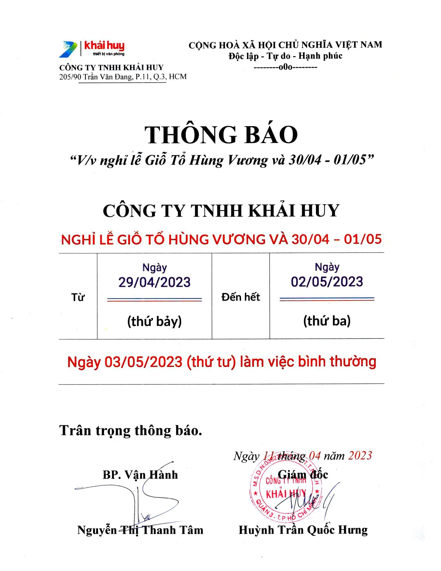 THÔNG BÁO NGHỈ LỄ GIỖ TỔ HÙNG VƯƠNG VÀ 30/04 - 01/05