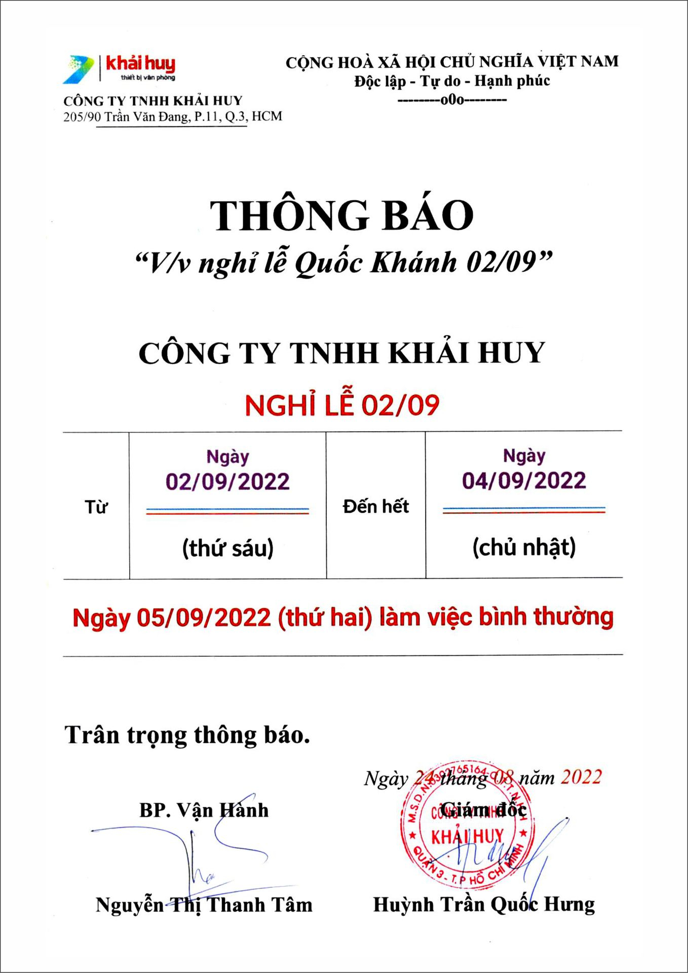 THÔNG BÁO NGHỈ LỄ QUỐC KHÁNH 02/09